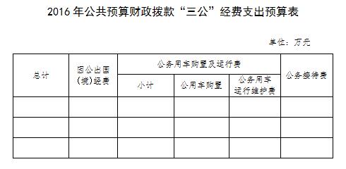 2016年,通过公共预算财政拨款安排的因公出国(境)、公务用车购置及运行费、公务接待费等"三公"经费预算共0万元。