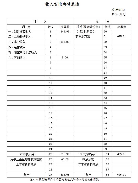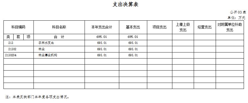 2015年支出总计695.01万元(其中本年支出695.01万元),包括:一般公共服务支出(类) 万元,社会保障和就业支出(类) 万元,......结余分配 万元,年末结转和结余 万元。