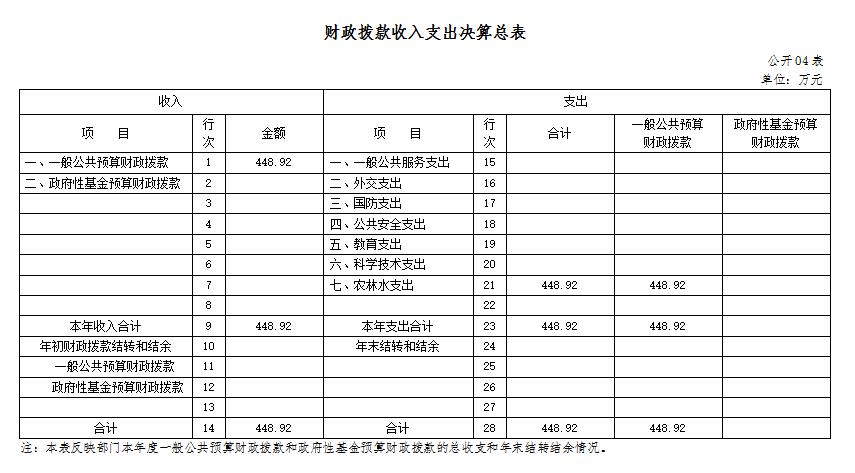 2015年财政拨款收入决算总计448.92万元,收入全部为一般公共预算财政拨款,无政府性基金预算财政拨款收入,包括一般公共预算财政拨款本年收入448.92万元、年初结转和结余 万元。