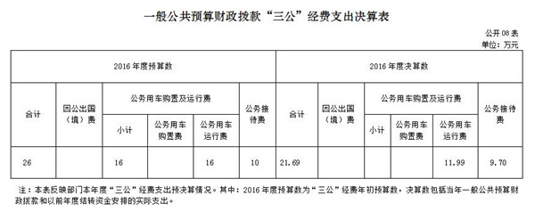788-sb.com2016年度一般公共预算财政拨款"三公"经费决算数为 21.69万元(含厅(局)机关及 个所属预算单位),其中:因公出国(境)费 万元,公务用车购置及运行维护费 11.99万元,公务接待费9.7 万元。