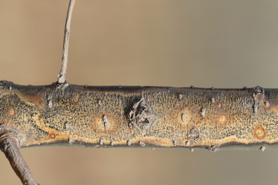 症状:苗木感病后在绿色树皮上初期出现黄褐色水渍状病斑,近圆形,逐渐扩展为梭形,中央稍凹陷。如病斑环绕树的主干,上部即行枯死,未环绕主干的当年多能愈合。